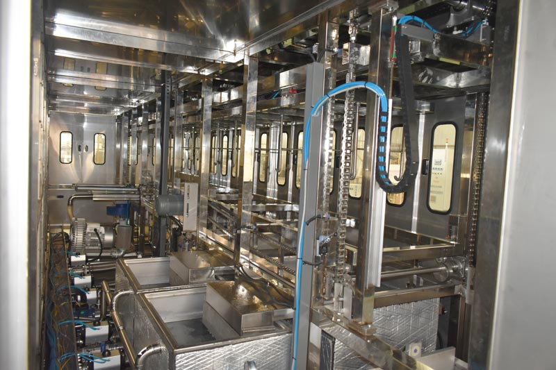 該設備針對清洗管件類工件,設備配有自動上下料工位、超聲波清洗系統,自動拋動、自動溢流和油污分離裝置,噴淋系統、自動高壓切水系統、自動烘干系統。機械手自動輸送系統采用高精度直線導軌配合高精度位置檢測傳感器,機械手可以準確的實現工件的抓取和放置。自動進排液和自動加溫系統完全實現了無人干預,自動運行,很大程度上降低了工人的勞動強度。先進的霧氣處理系統可以將清洗時產生的霧氣冷凝回流,空氣經過濾和活性炭吸附后排出。