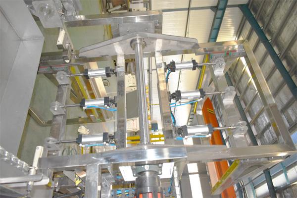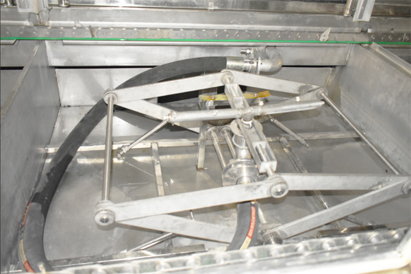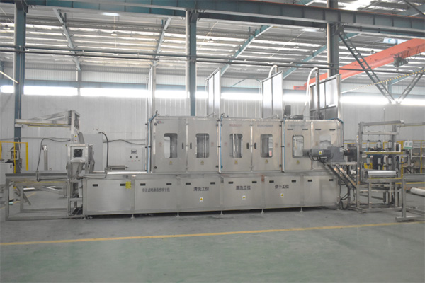 01)通過設(shè)備上面的觸摸屏設(shè)置設(shè)備運(yùn)行的各項(xiàng)參數(shù),待清洗料桶通過 AGV 小車輸送到緩存支架上,由夾持裝置將工件加緊經(jīng)翻轉(zhuǎn)電機(jī)將工件旋轉(zhuǎn) 180 度,使料桶口向下置于上料工位?!?2)設(shè)備運(yùn)行裝置自動(dòng)將料桶運(yùn)行到噴淋粗洗工位,高壓噴淋粗洗工位設(shè)有桶內(nèi)壁旋轉(zhuǎn)噴頭,對(duì)桶內(nèi)壁進(jìn)行清洗。桶體外側(cè)設(shè)置頂部及側(cè)面噴頭對(duì)料桶外壁進(jìn)行清洗。工位設(shè)置探測器,工件在運(yùn)動(dòng)時(shí)噴淋工位停止工作。→(03)料桶經(jīng)過噴淋粗洗后設(shè)備運(yùn)行裝置自動(dòng)將料桶運(yùn)行到噴淋精洗工位,高壓噴淋精洗工位設(shè)有桶內(nèi)壁旋轉(zhuǎn)噴頭,對(duì)桶內(nèi)壁進(jìn)行清洗。桶體外側(cè)設(shè)置頂部及側(cè)面噴頭對(duì)料桶外壁進(jìn)行清洗。工位設(shè)置探測器,工件在運(yùn)動(dòng)時(shí)噴淋工位停止工作。→(04)噴淋精洗完畢后,料桶運(yùn)行到高壓風(fēng)切吹干工位,熱風(fēng)吹干采用高壓風(fēng)機(jī)和熱風(fēng)發(fā)生器,可以對(duì)工件進(jìn)行快速干燥?!?5)工件經(jīng)熱風(fēng)吹干完畢后運(yùn)行至下料翻轉(zhuǎn)工位。由夾持裝置將工件加緊進(jìn)行翻轉(zhuǎn),工件翻轉(zhuǎn)180度以后放置到緩存支架上由AGV小車帶動(dòng)料桶進(jìn)入干凈桶暫存區(qū)。