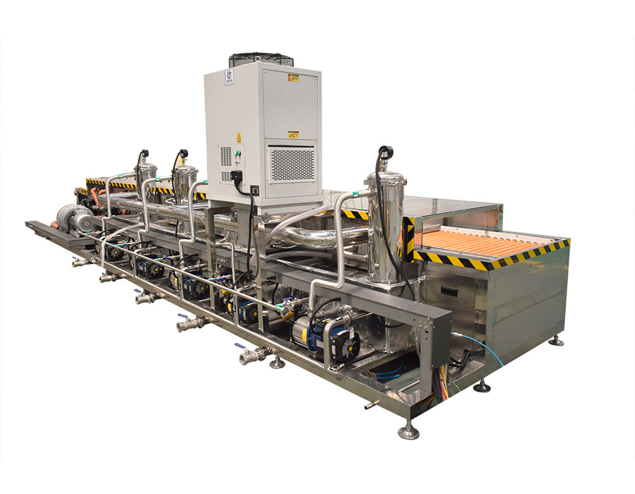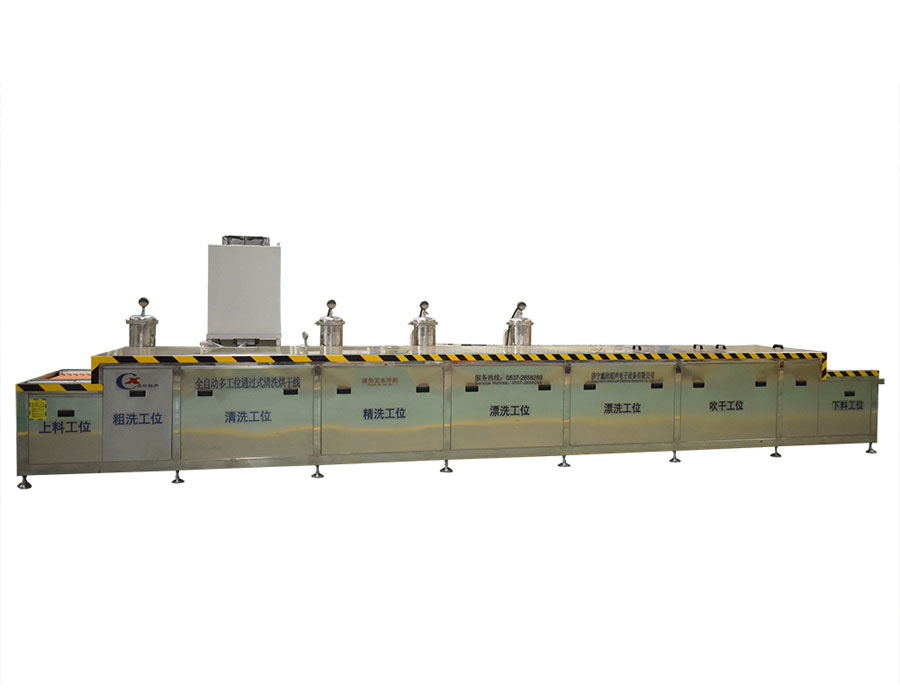 本設(shè)備為通過(guò)式玻璃清洗烘干線,清洗部分傳動(dòng)形式采用專用輸送鏈條帶動(dòng),與玻璃接觸面都是橡膠包裹之后的滾筒,清洗該設(shè)備有上料滾筒線、噴淋清洗工位、毛刷清洗工位、噴淋清洗工位、超聲波清洗工位、噴淋漂洗工位、風(fēng)干工位、下料滾筒線、溫控水加熱系統(tǒng)、溫控空氣加熱系統(tǒng)、PLC+觸摸屏控制系統(tǒng)、管路系統(tǒng)及智能電器控制系統(tǒng)等組成。該設(shè)備清洗效果好、提高了工件的清潔度。該機(jī)結(jié)構(gòu)設(shè)計(jì)及工藝安排合理、自動(dòng)化程度高、清洗精度高,有效解決了此類工件的清洗難題
